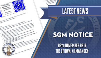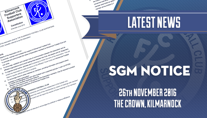 It is hoped that as many members as possible will attend the SGM on 26th November at the Crown Inn High Glencairn Street Kilmarnock when a two-thirds majority will be required to approve the new Constitution which will then assist KFCSA in dealing with the issues facing the Supporters of Kilmarnock FC at this time.