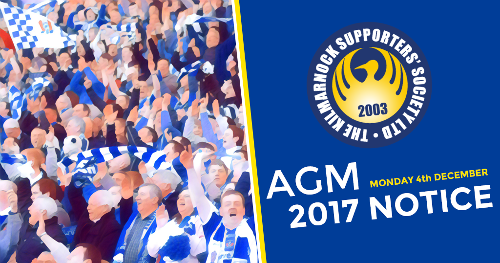 Notice is hereby given the Annual General Meeting of the Kilmarnock Supporters’ Society Limited will be held in the The Portmann Hotel 42 Portland Road, Kilmarnock KA1 2DL on Monday 4th December 2017 at 7pm for 7:30pm.